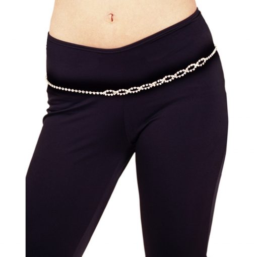 - A belt made of a single strand of silver rhinestones, with nine slim oval rhinestones in the front