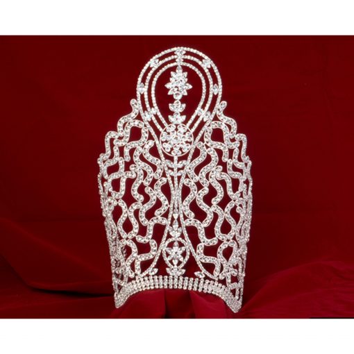 - A women’s crown with silver rhinestones in a very tall and wavy design