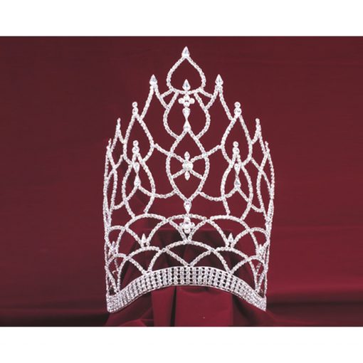 - A women’s crown with silver rhinestones in a very tall yet elegant, pointed design