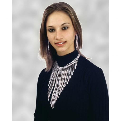 - The necklace has a cascade of rhinestone strands in the front stemming from a band of three rhinestone strands
