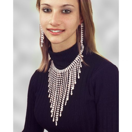 - An elegant set of silver rhinestone earrings and a silver rhinestone necklace